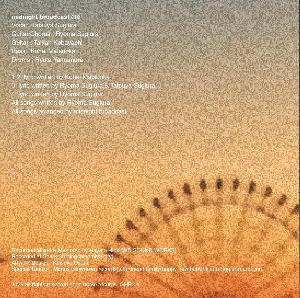 midnight broadcastはGt/Cho Sugiura Ryomaの宅録から活動を開始。北欧ノルウェーにあるSlow down recordsレーベルオーナーMarius氏からの音源リリース依頼をきっかけに2024年に本格始動。現在、愛知県豊田市を中心に活動しているEmo/indierockバンド。